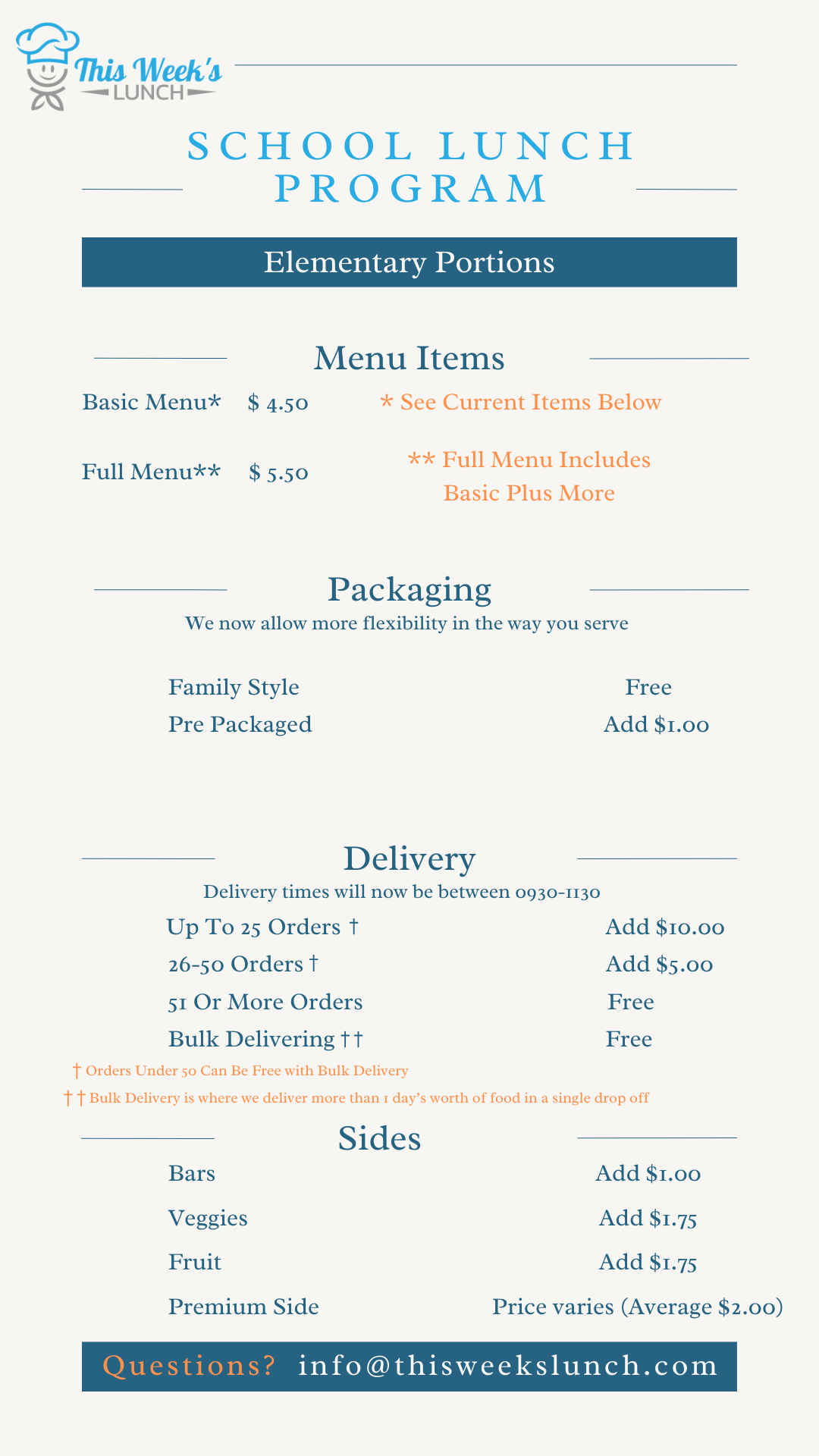 Our daily lunch program can be customized to accommodate any number of students, and include hot or cold main items, options for packaging/serving and options for including side items, snacks, and fruit or veggies, and options to order from 1-5 days per week.