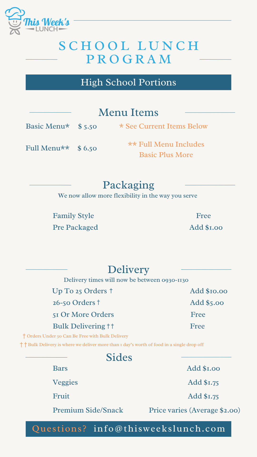 You can see our price list to the right. Our 'High School' portions are larger than our 'Elementary School' portions (for example 12 ounce pasta instead of 10 ounce pasta), however there is no requirement that high schools order the larger portion. We also have two tiers of items, based on the cost of ingredients. The basic items are more than adequate and can be used in a lot of different combinations to keep the variety up, while the full menu items are priced a bit higher due to the cost. You are fully able to mix and max items from day to day to maximize your budget.