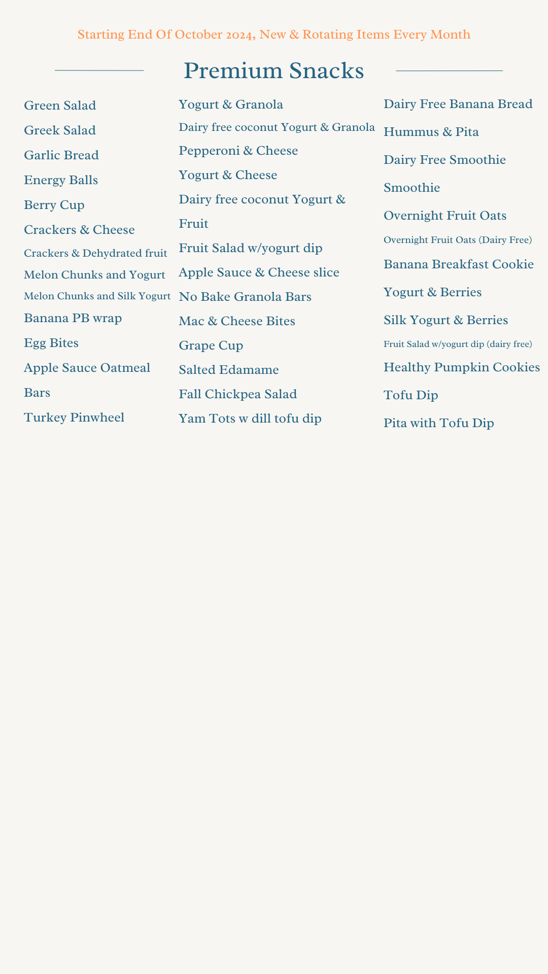 Our assortment of house-made snacks (like healthy cookies and banana bread), pre-made snacks (like granola bars and crackers), side dishes, and produce options can all be added on to your order, either every day or as needed.